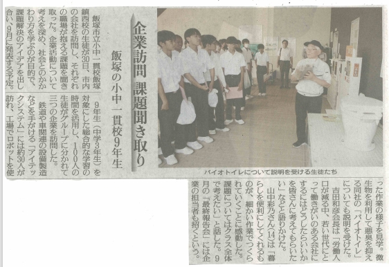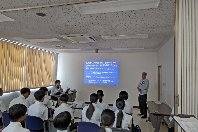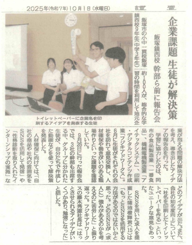 令和7年度9年生は、単元名「未来のわたし、地域を探ろう。~企業からミッションを受けて~」企業コラボプロジェクトを行いました。飯塚市経済部産学振興課や福岡同友会飯塚支部と連携して行いました。筑豊地区の企業が抱える課題を解決することを通して、自己の生き方や身近な社会のかかわり方について考えました。学習の流れは、はじめに、企業の方にゲストティーチャーとして本校に来校(5月30日)してもらい、企業が抱える課題を提示してもらいました。そして、企業訪問(6月30日)を行い、職場の人から話をきいたり企業を見学したりし課題意識を高めました。課題追究を行い、企業の方や友達の課題追究の様子やアドバイスを聞き、参考にすることで、応え(こたえ)を練り上げ深めさせる中間発表会(9月4日)、企業を招いて最終報告会(9月25日)、文化祭での発表(10月10日)などを行いました。